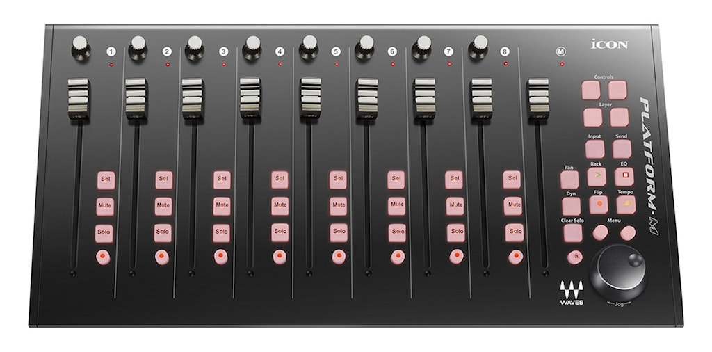Plateforme d'icônes de vagues M (dans la première image) C'est une surface compacte, escroquer 8+1 faders motorisés pour contrôler les entrées, plugins et bus. Comprend huit boutons multifonctions, Boutons de fonction lumineux et jog pour un accès rapide aux réglages des paramètres.