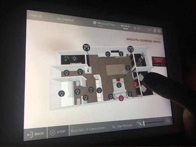 Le hub central est Philips RoomFlex, un système de contrôle de pièce entièrement configurable pouvant intégrer l'éclairage avec des capteurs et des systèmes tiers tels que le chauffage, ventilation ou climatisation (CVC), rideaux et applications de réservation de chambres. Utiliser un seul panneau de contrôle, Les clients peuvent sélectionner leur scène d'éclairage et leur température en fonction de leurs préférences.