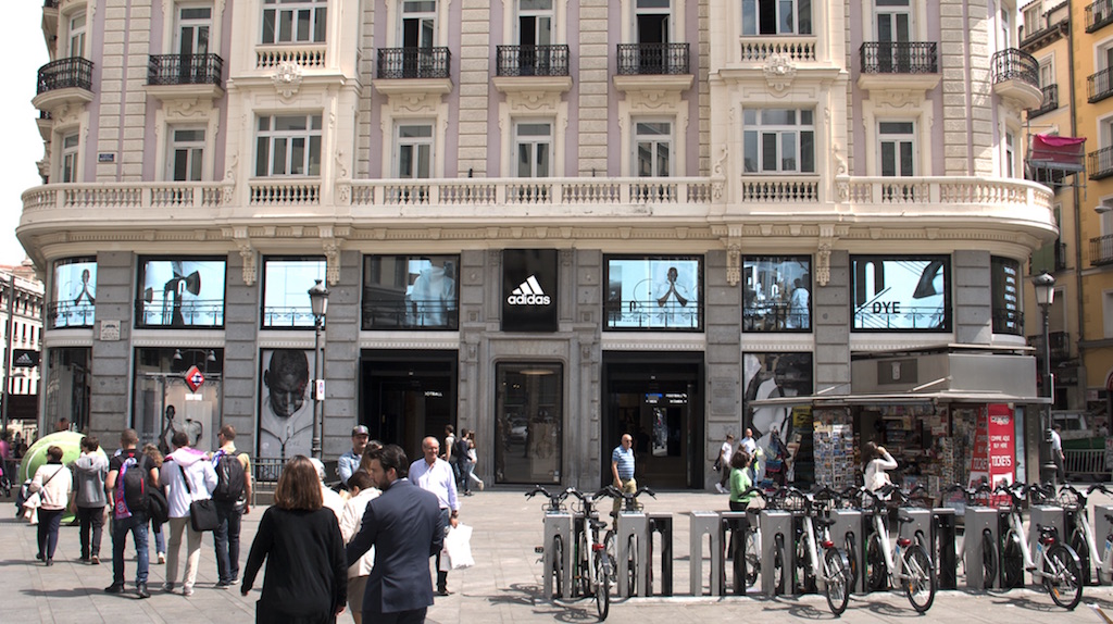 Ubicada en un edificio emblemático de la Gran Vía madrileña, la firma deportiva Adidas ha cambiado tecnológicamente su establecimiento estrella a nivel nacional, apostando por soportes digitales visuales de tecnología Led, que ocupan ahora los grandes ventanales del establecimiento de la marca de las tres rayas, con un espectacular resultado e impacto exterior en esta transitada calle.