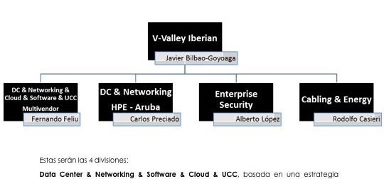 Pour cette raison, V-Valley se focaliza ahora en cuatro divisiones, cada una con un equipo especializado: técnicos y consultores preventas, desarrolladores de negocio y sales specialists, brand managers & marcom, account managers, etc.; bajo la supervisión en todas de Javier Bilbao-Goyoaga, presidente de V-Valley SLU.