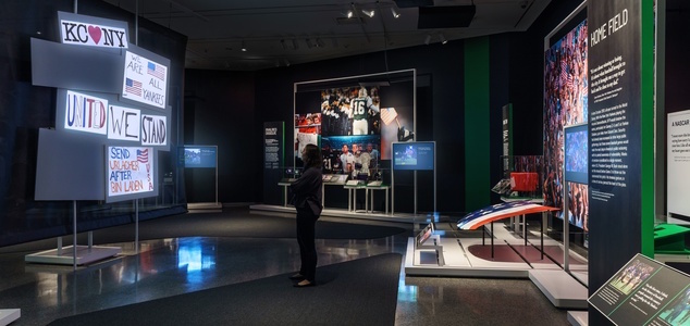 Este especialista ha sido responsable de la estructura de la exposición, el diseño gráfico y la producción de sonido y medios audiovisuales, como un relato cronológico. Spécifiquement, comienza en los momentos posteriores a los ataques del 11 Septembre, cuando se suspendieron los deportes nacionales y se utilizaron los estadios del área metropolitana de Nueva York para apoyar los esfuerzos de socorro.