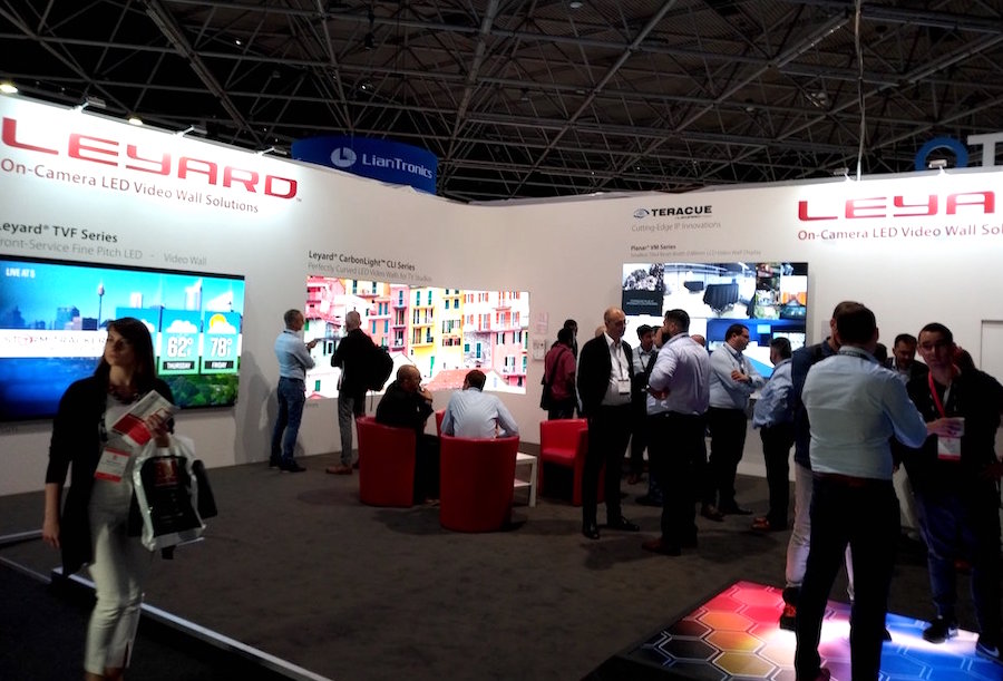 En el espacio expositivo del fabricante se mostraba un videowall Led curvo, compuesto por módulos de la serie CLI Leyard CarbonLight, con pixel pitch de 1,9mm; una línea de pantallas Led ligeras especialmente indicadas para alquiler y montaje e instalaciones fijas.