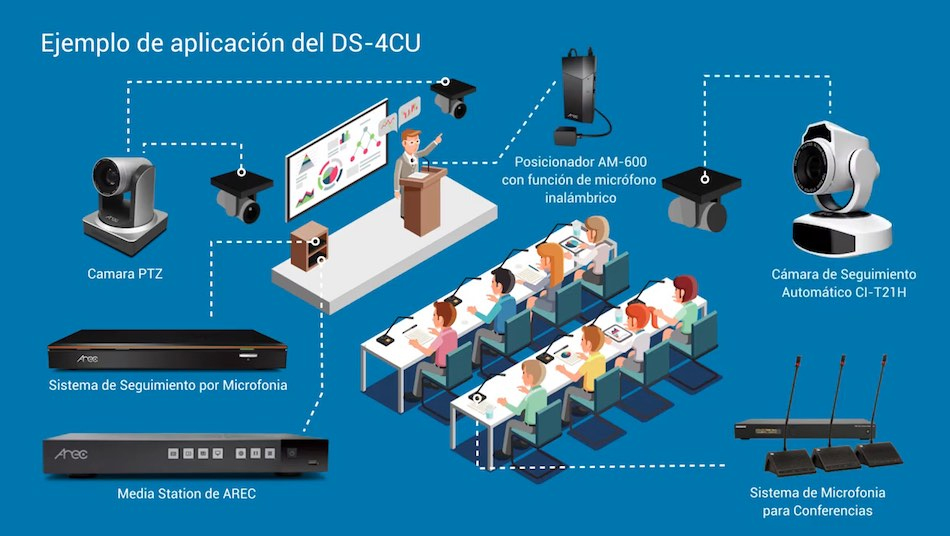 Arec DS-4CU automatiza la conmutación de la señal de la cámara, añade una superposición personalizada y enfoca automáticamente al orador que ha pulsado el botón de su micrófono. Esto permite que todos los participantes y espectadores del pleno puedan ver un primer plano, con un grafismo que identifica al ponente, en la pantalla local cuando el orador habla.
