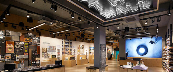 La primera planta cuenta con una “shoppable timeline” de artículos de época, libros, discos de vinilo y mucho más, así como con una cabina de DJ y una pared de altavoces vintage que está en funcionamiento. La segunda alberga una “customization zone” en la que los clientes pueden diseñar y personalizar sus propios zapatos y prendas, además de contar con un espacio para organizar talleres y eventos semanales.