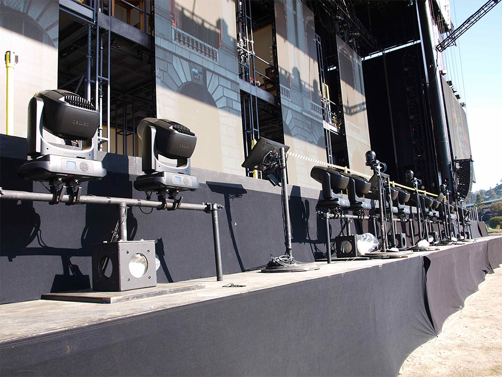 “Hemos montado conciertos antes en el Golden Gate Park, pero no se ha producido nada de esta magnitud en el exterior en los tres años que llevo en la compañía”, señala Justin Partier, director de iluminación de la Ópera de San Francisco. “Consideramos varios lugares y encontramos que el Marin Center era la mejor ubicación. Así que construimos un escenario y utilizamos el decorado de una producción de Fidelio aún no celebrada, en una nueva configuración”.