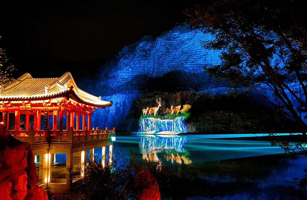 Al caer la noche, el parque se baña en una combinación de luces azules, rojas y amarillas en medio de un espectáculo de luces muestra impresionantes proyecciones en una ladera, utilizando cuatro proyectores láser 1DLP Christie DWU2022-HS, instalados por Zhongqing Yingye Group.