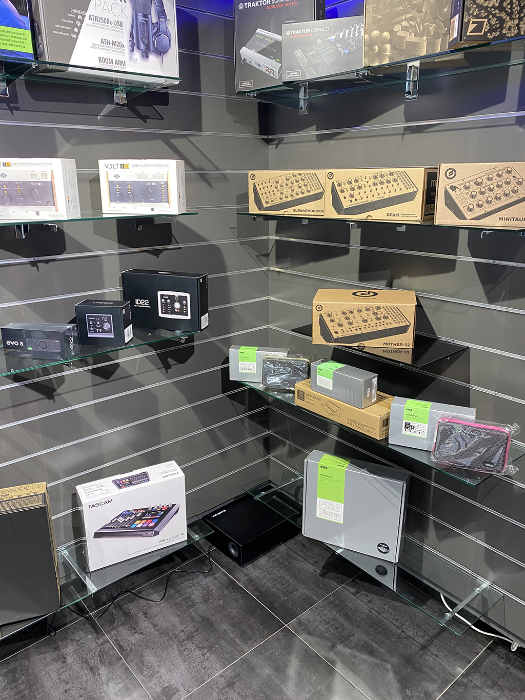 La tienda también cuenta con una zona que simula un estudio de grabación, donde los clientes pueden probar diferentes equipos. En las paredes de este espacio se han instalado diferentes modelos de los paneles acústicos Artnovion, de forma que los clientes pueden observar su encaje en el entorno de un estudio y, en cierta medida, algunas de sus características acústicas.
