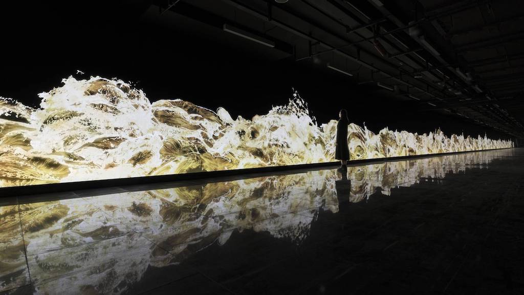 Este enorme videowall Led de Liantronique, avec pas de pixel 2,5 mm, denominado Gold Waves, muestra contenido tridimensional del movimiento de las olas, conçu par teamLab.