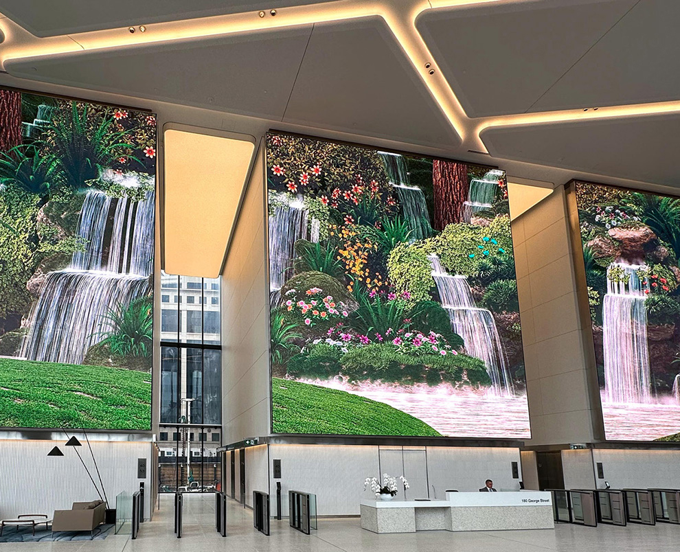 En la entrada de este edificio de oficinas de 53 pisos de altura de Sídney, Diversified ha instalado cuatro enormes pantallas Led de interior SNA Displays Bold, dos de las cuales se unen para envolver una esquina de 90 grados y que se combinan para crear una superficie de 435,8 m2.