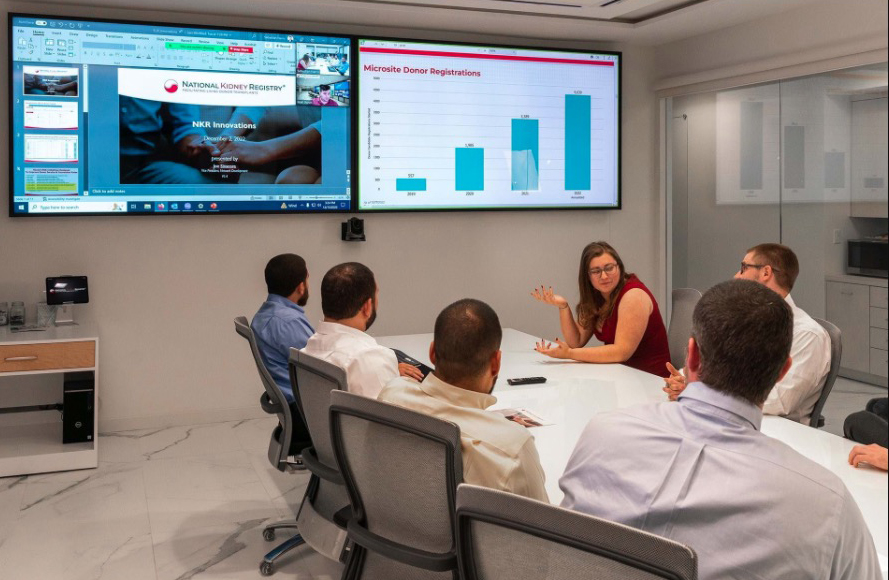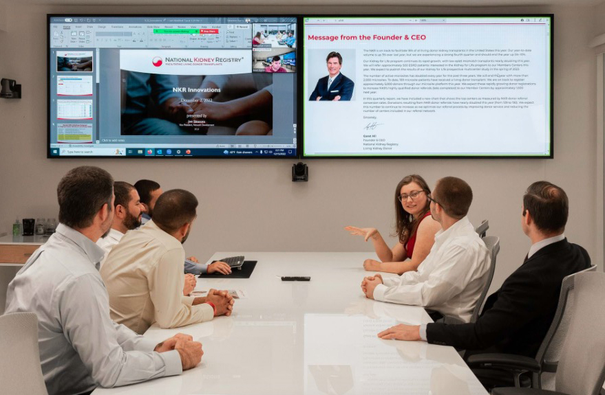 La technologie de Planaire ha sido utilizada en todas las instalaciones del National Kidney Registry. Le centre d'opérations dispose d'un mur vidéo, configuré par 12 pantallas UltraRes Serie X de 85 pouces, y cuatro pantallas más de 100 pulgadas se han montado en la sala de juntas y de formación.
