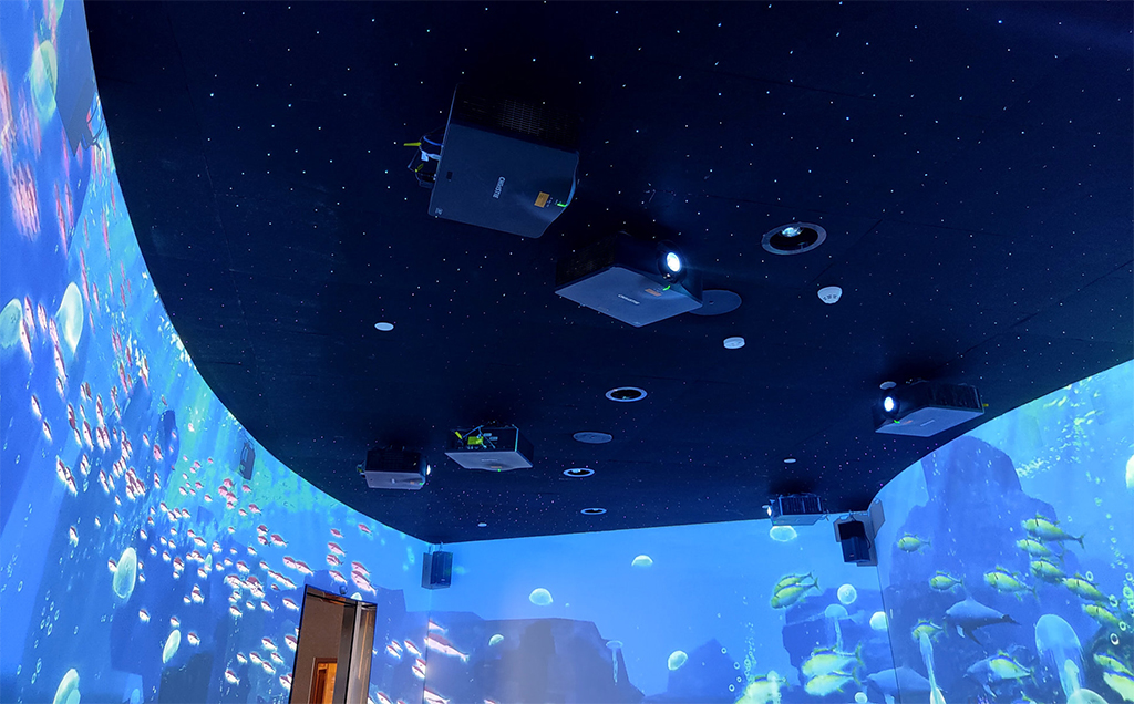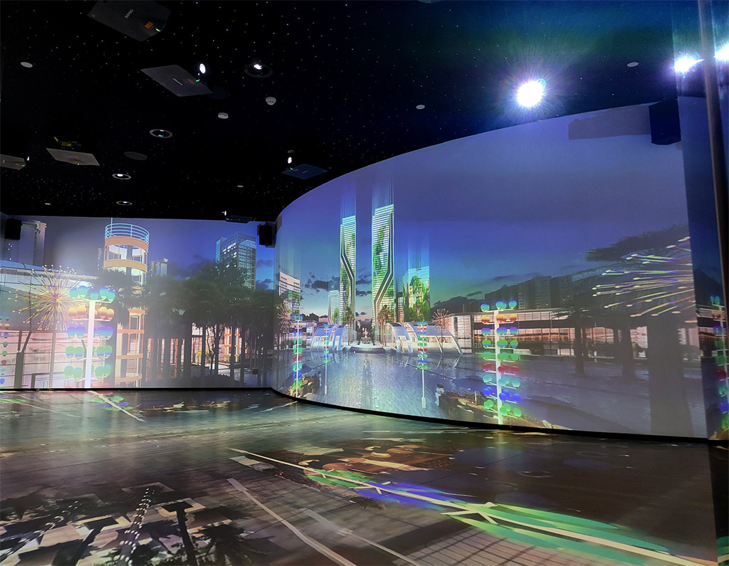 Las áreas de exposición del Talent Hub están equipadas con más de una docena de proyectores láser Christie DWU860-iS y DWU960-iS, y un proyector láser 1DLP 4K7-HS. Las coloridas proyecciones sobre una gran pantalla curva sumergen a los visitantes en un entorno vasto y realista, mientras que una impresionante pantalla panorámica independiente de 270 grados transporta a los invitados a un mundo en el que se convierten en parte integrante del contenido proyectado.