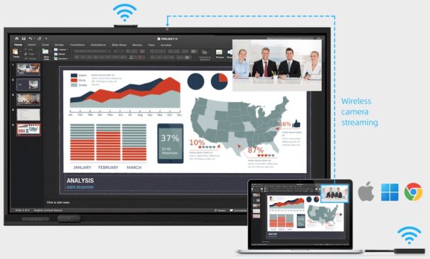 El hardware de colaboración Innex Connect Pro está integrado, lo que permite compartir contenidos fácilmente. Las pantallas táctiles incluyen dos dongles USB-C para establecer una conexión entre el portátil y el equipo de visualización sin necesidad de Internet, garantizando reuniones más seguras.