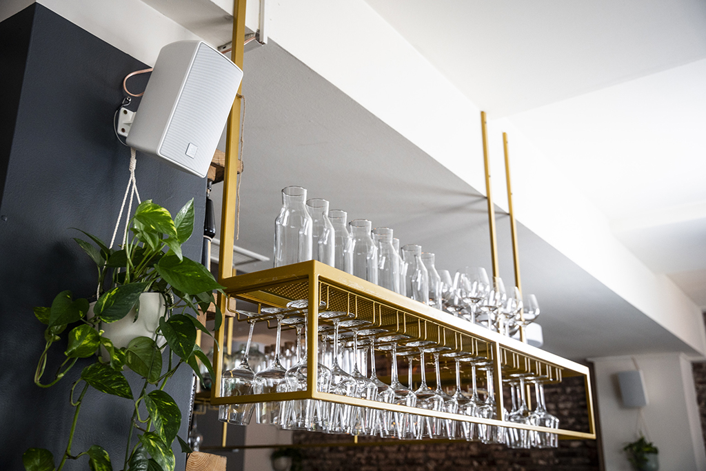 El personal del lugar controla el lugar a través del controlador de pared ZonePad 4 y Zone 8 para que los niveles de volumen se puedan administrar en cada espacio del restaurante, incluido el salón de eventos en el sótano.