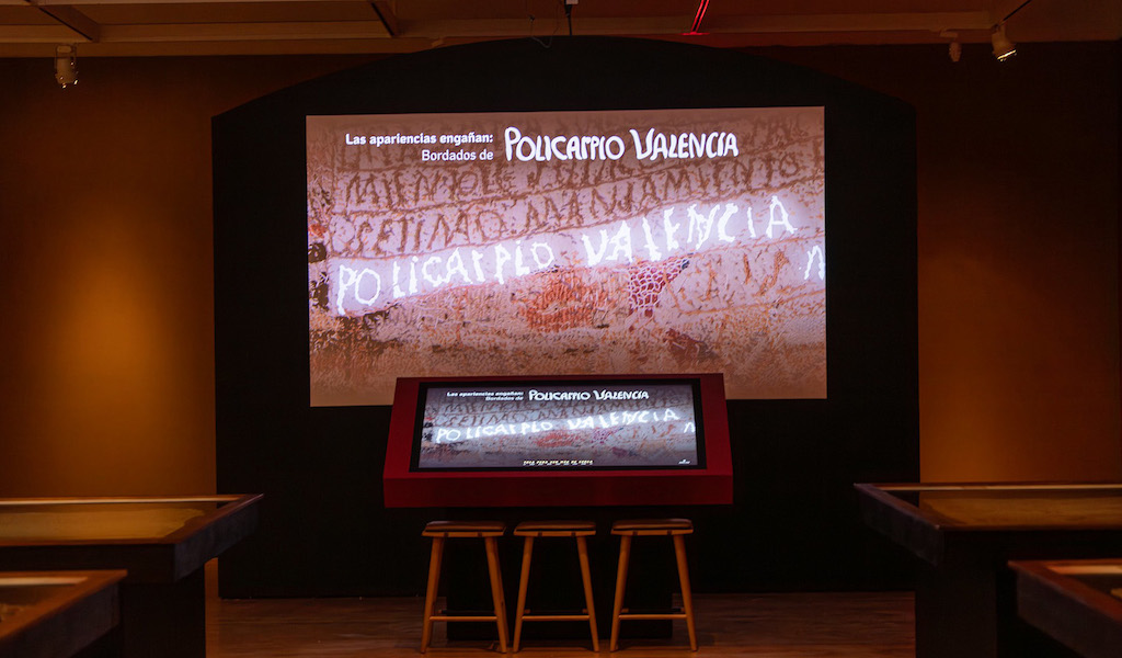Proyecciones a gran escala permiten ver de cerca los textiles bordados, incluyendo el reverso de las obras, que a menudo presenta detalles tan intrincados como el anverso. En el caso de los textiles con información relevante, los visitantes pueden escuchar la lectura en voz alta de estos mensajes, en inglés o español, con la narración de los descendientes vivos de Valencia.