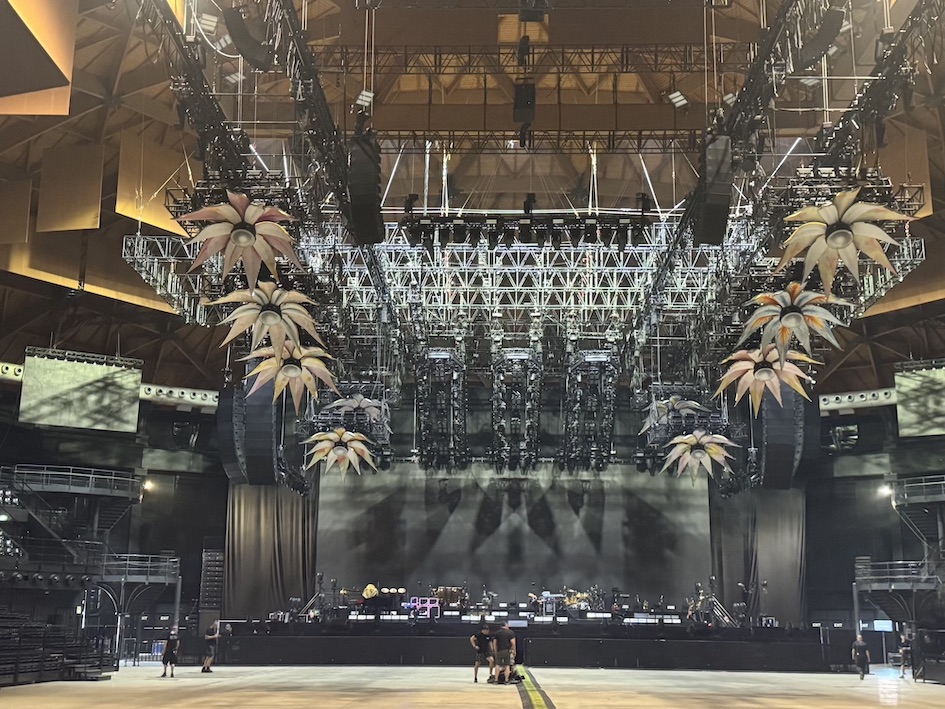 Lo que tenía que ser una disposición bastante estándar del arreglo se complicó por causa de uno de los detalles escénicos más destacados del espectáculo: clous piezas móviles, a modo de cápsulas equipadas con “flores electrificadas” que, aunque creaban un efecto espectacular, a veces obstruían el sonido del sistema PA principal.