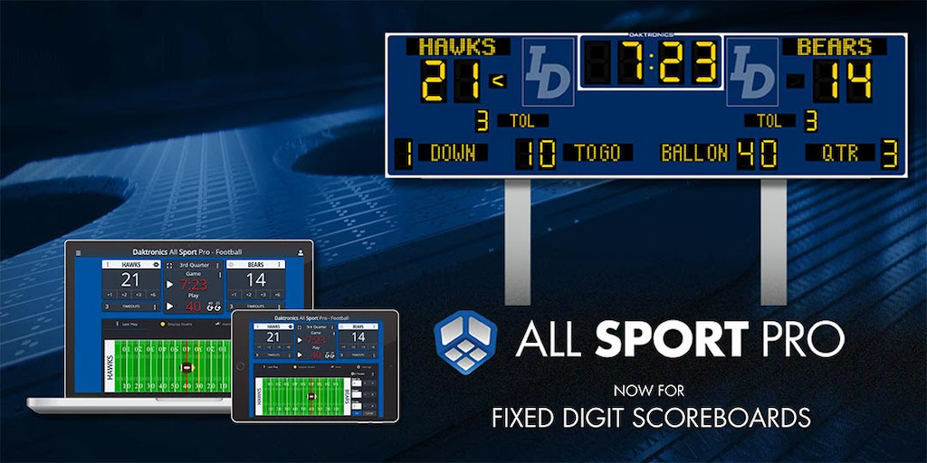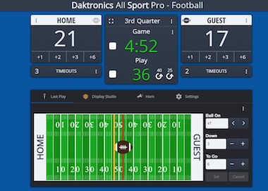 Esta innovación de Daktronique en la consola All Sport Pro proporciona a los propietarios de marcadores tradicionales la misma solución de puntuación digital y flexibilidad de dispositivos, accesible a través de cualquier navegador web moderno desde otros equipos, como ordenadores portátiles o tabletas.
