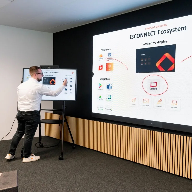 Disponible en 138 oui 165 pouces, esta pantalla está diseñada para una gran durabilidad y una instalación segura. Lleva preinstalado el software i3Connect Studio, que facilita la configuración con un intuitivo interfaz que permite empezar a trabajar de inmediato ya sea para una presentación, una clase, una reunión o sesión creativa.