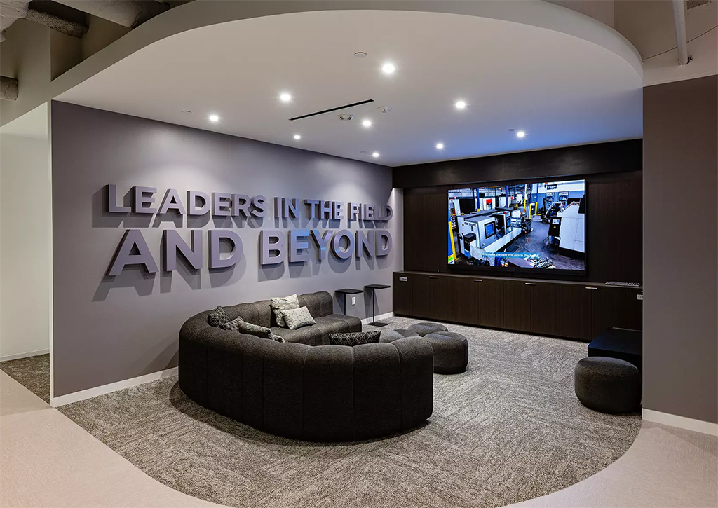 En toda la planta rediseñada, Inventure ha incorporado elementos arquitectónicos que reflejan la identidad de marca de la compañía. “Las paredes angulares se diseñaron para que coincidieran exactamente con el ángulo de su logotipo”, comenta Mixon. “También aprovechamos la dualidad entre el diseño angular y los elementos circulares, y ahí es donde las curvas cóncavas y convexas del videowall entraron en juego. Durante las visitas guiadas, los videowalls cóncavos actúan como puntos de encuentro, ofreciendo experiencias inmersivas”.