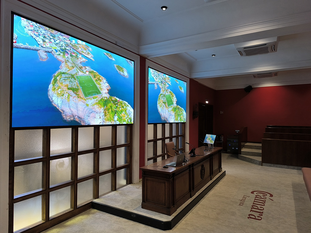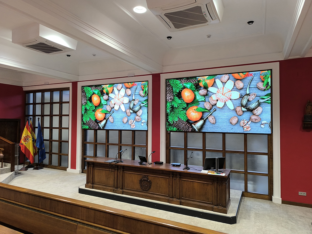 Deux écrans LED Full HD grand format ont été installés, capable d'offrir une image nette et un impact visuel élevé. Grâce à sa conception, Ils permettent une visibilité optimale depuis n'importe quel point de la salle et assurent une projection claire du contenu dans les présentations., événements institutionnels ou sessions de formation.