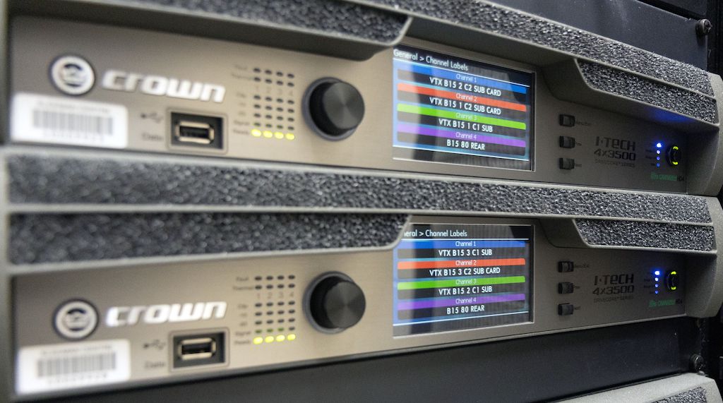 El diseño final del sistema cuenta con tres suspensiones de ocho altavoces JBL VTX A6, apoyadas por otro trío de subwoofers VTX B15 en configuración cardioide, nourri par amplificadores Crown I-Tech HD 4x3500W, ambas compañías de Harman Professionnel.