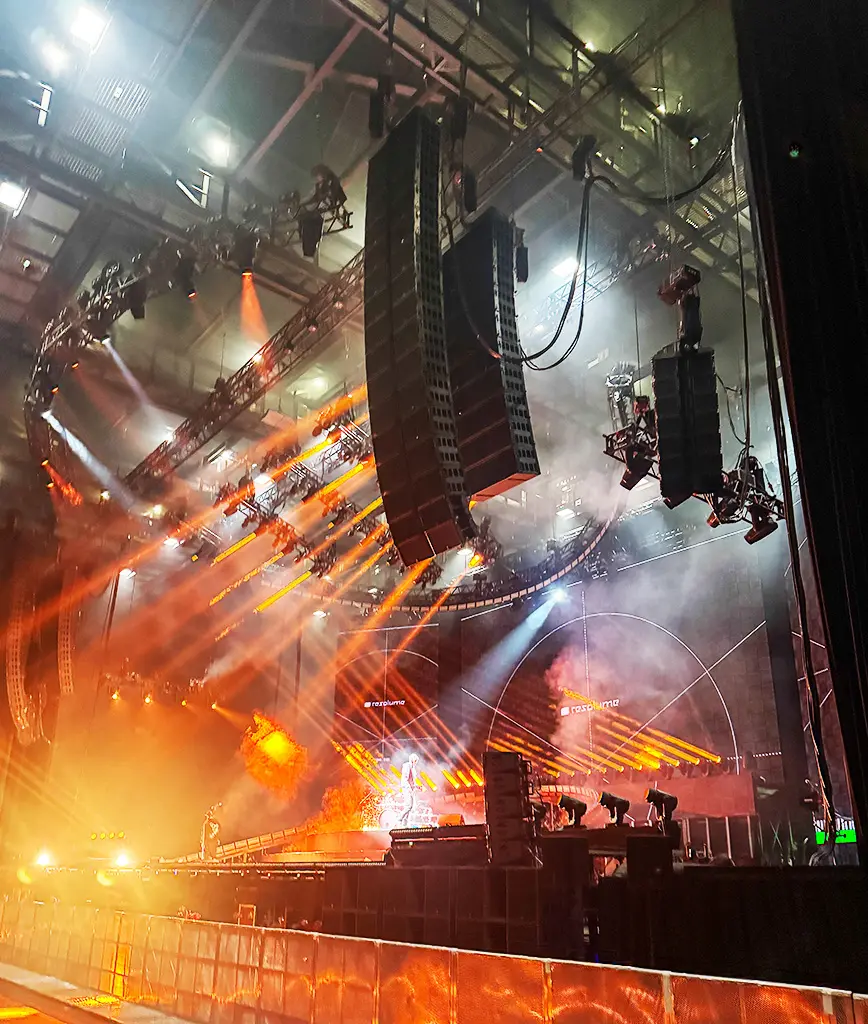 sur scène, una configuración de monitores compuesta por 12 X15 et deux KS21 proporcionó un refuerzo complementario a los in-ears sin saturar la mezcla. Al no haber instrumentos electrónicos en el escenario y con la guitarra y el bajo conectados directamente a las pistas, el escenario se mantuvo limpio. Como comenta Sørensen: “No hay altas frecuencias procedentes del escenario. La imagen sonora es la misma en todas partes”.
