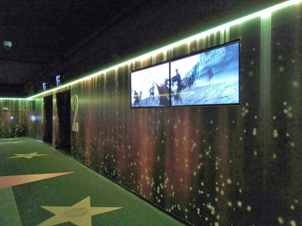 En el hall de entrada a las salas de cine se han instalado dos videowall panorámicos que dan la bienvenida a los clientes, soportes sobre los que se emiten de forma programada trailers en alta definición de los estrenos y avances de futuras películas. Estos videowall Led de gran formato también están preparados para soportar la emisión de inserciones multimedia promocionales relacionadas tanto con la oferta de ocio y restauración del centro como de anunciantes externos.
