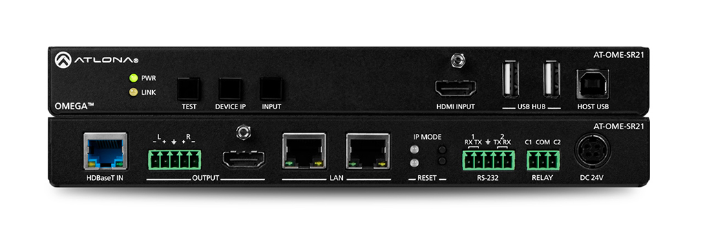 El AT-OME-SR21 incorpora un receptor HDBaseT y un escalador 4K/UHD con una entrada HDMI local adicional. Este equipo recibe vídeo 4K/UHD, 4:2:0 a 60 Hz junto con señales de audio y control integradas a una distancia de hasta cien metros.