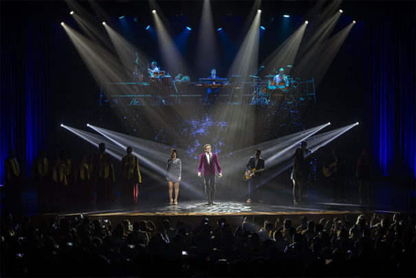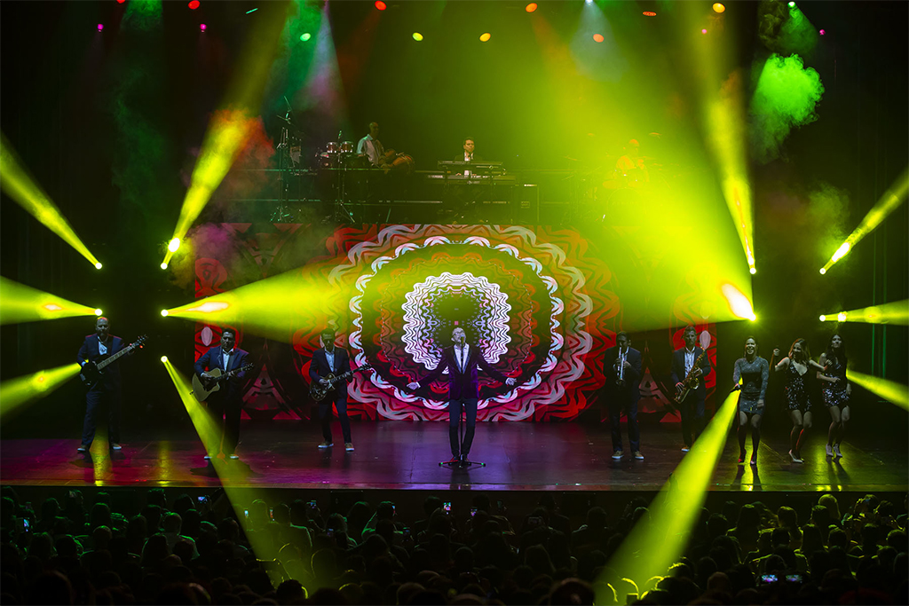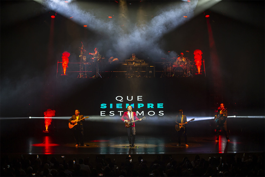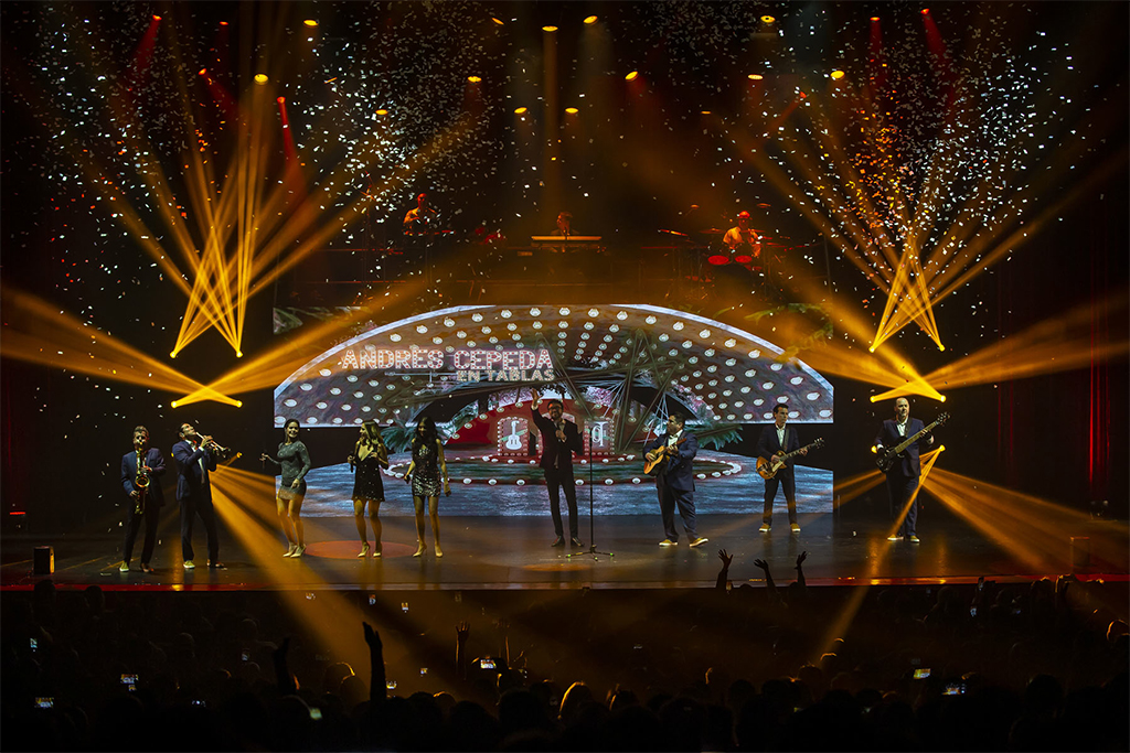 La banda de Andrés para esta serie de espectáculos fue enriquecida por los sonidos de una sección completa de bronces. Los músicos y los coristas estaban divididos, algunos en una plataforma elevada encima de la pantalla y otros en el tablado junto al artista colombiano.