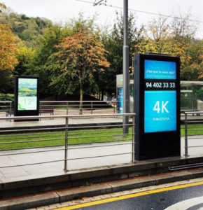 Este proyecto de modernización urbanista y publicidad exterior digital se configura con la instalación de tres mupis de doble cara, con pantalla LCD y resolución de 2.160×3.840p, en algunas paradas del tranvía de Bilbao con gran afluencia.