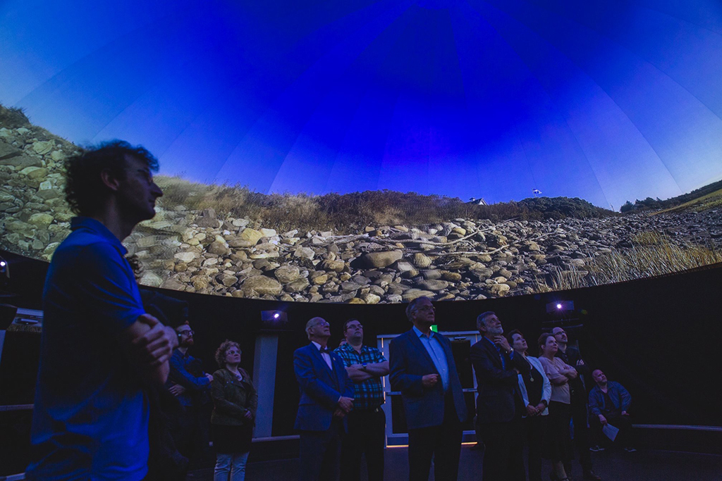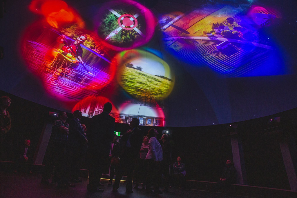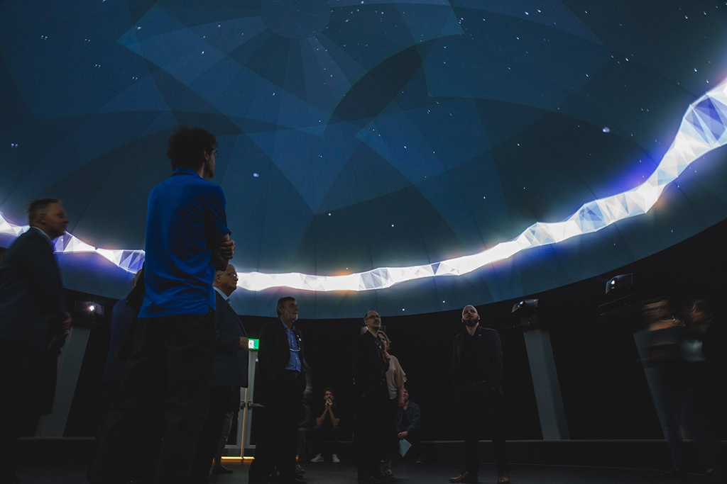 Para la proyección de 360° de este domo, de casi 11 metros, se ha utilizado el media server Pixera y ocho proyectores Christie DWU1075-GS para mapear la superficie. Una cámara de 180° proporciona la capacidad de escanear la geometría del domo y calibrar el mapeo utilizando el software de Vioso.