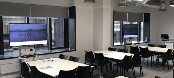 A las salas de conferencia y a las aulas se las ha dotado de cuatro proyectores láser 5000AL. Seis pantallas UHD de la serie V de 55 pulgadas y dos pantallas de pizarra interactiva de la serie CB de 65″ están montadas en la cabecera de varias mesas de estudio en grupo en los espacios de colaboración. Finlay afirma que «debido a los grandes ventanales que van del suelo al techo del nuevo campus, la superficie antideslumbrante era imprescindible para reducir los reflejos».