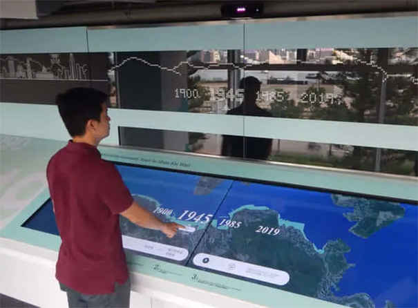 El Departamento de Planificación de la HKSAR se puso en contacto con los especialistas locales en AV Wide Smart Technology para crear el concepto de diseño de la exhibición interactiva. Para la superficie de la muestra, la compañía diseñó una pieza de vidrio templado de 110 pulgadas bajo la cual dos pantallas de 55 pulgadas, montadas de punta a punta, visualizan el contenido.