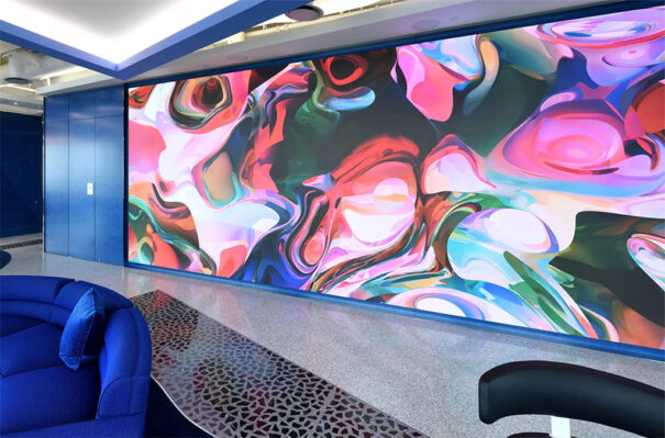 Los vídeos que se muestran en las pantallas proporcionan una extensión natural de las obras de arte que se pueden ver por el vestíbulo, según Malcarney. «Se mueve constantemente y realmente aparece en la habitación. Desde un punto de vista visual, los videowall son fenomenales. Lo único que rivaliza es la vista de la ciudad desde las ventanas».