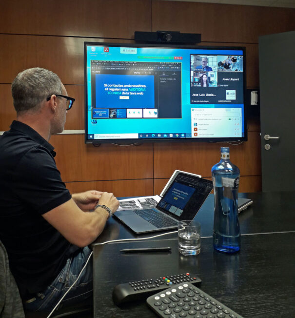 La sala de juntas de esta asociación de Cataluña cuenta con una solución compuesta por un monitor interactivo Clevertouch Impact de 75” y una barra de videoconferencias Poly Studio para realizar presentaciones presenciales, virtuales e híbridas.
