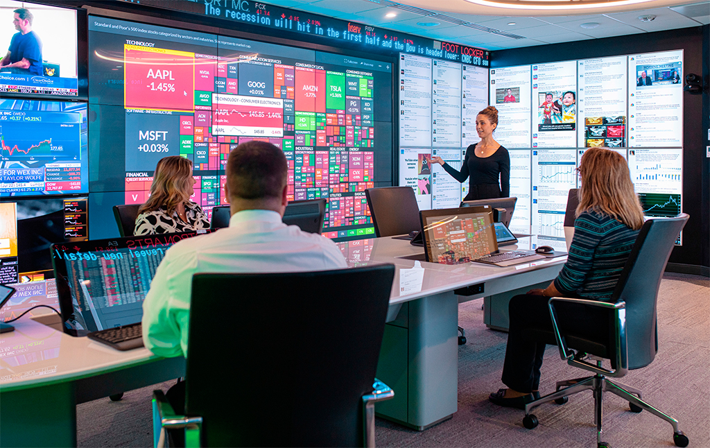 Con la totalidad de las pantallas interactivas de Planar, la sala Venture Visionary Lab ofrece un entorno colaborativo para la investigación, planificación y análisis de inversiones.