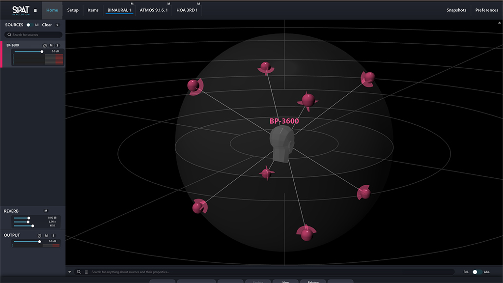 SPAT Revolution es un motor de mezcla de audio inmersivo en tiempo real de última generación, en el que los objetos fuente entrantes, como la captura desde el Audio-Technica BP3600, pueden posicionarse en el espacio mediante una intuitiva interfaz gráfica.