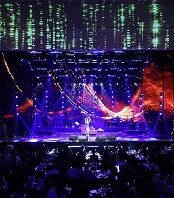 Para crear una experiencia inmersiva, se precisaba una visualización de 270 grados, mediante la cual las áreas de actuación y el contenido digital de apoyo aparecen en todos los lados de la sala excepto en el suelo y la pared trasera, frente al escenario.