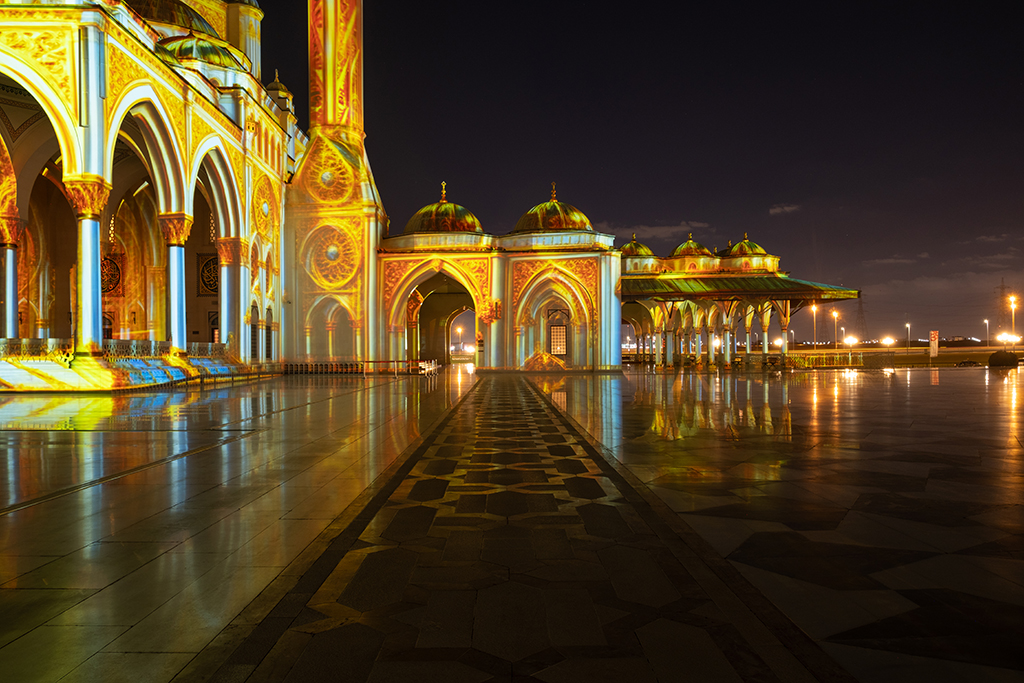 A diferencia de la proyección sobre la montaña de la presa de Al Rafisah, que incluía imágenes en movimiento y música, en el caso de la mezquita de Sharjah Artabesk se limitó a imágenes fijas, dadas las sensibilidades asociadas a la proyección sobre un lugar religioso. A pesar de ello, las imágenes potentes y ultra brillantes generadas por los proyectores Titan Laser hicieron que la mezquita, sorprendentemente iluminada, se considerara uno de los momentos más destacados del festival.