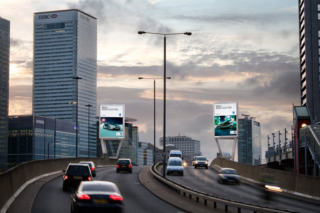 オーシャンアウトドア ha montado dos enormes pantallas de publicidad digital al aire libre en el Este de Londres. Las estructuras, bautizadas como ‘The Two Towers East’, que exhiben publicidad de la marca automovilística BMW, se han ubicado en la autopista que va al Canary Wharf, la City londinense y el aeropuerto de Londres, para captar la atención de los empleados que trabajan en el distrito financiero de la capital británica. Son una réplica exacta de ‘The Two Towers West’, una instalación similar que se encuentra en la carretera que va del aeropuerto de Heathrow al West End londinense.