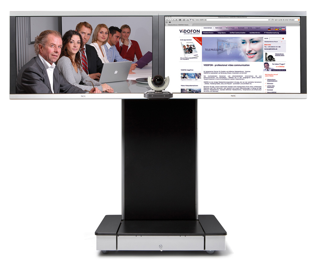 El buque insignia de las soluciones de telepresencia de esta compañía es el modelo Media Presence System, un sistema de conferencias representativo que responde a las más altas exigencias. Todos los componentes están armonizados e integrados en el panel de pared y encajan en una imagen conjunta y elegante. Cámaras y pantallas están detrás de unas pantallas de cristal tintado que a su vez hacen las funciones de altavoces y unen todos los elementos de la pared multimedia.