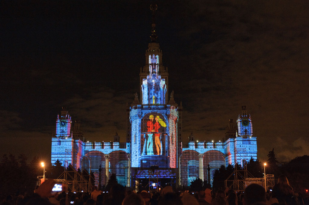 彼 4 9月, Día de la Ciudad de Moscú, la capital rusa albergó un singular acontecimiento visual: el Alfa-Show 4D, un espléndido espectáculo de videoproyección en en Vorobyevy Gory (las Colinas del Gorrión), conmemorando el vigésimo segundo aniversario de Alfa-Bank, el mayor banco privado de Rusia. Durante media hora, la fachada del edificio principal de la Universidad Estatal de Moscú se transformó en una gigantesca pantalla de 25.500 m² ante las casi 800.000 personas que fueron testigos de un show audiovisual de enorme belleza.