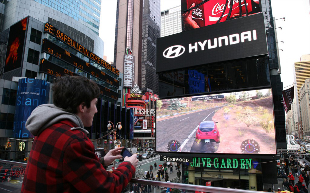 デジタル屋外での活用方法の新しい例 (ドーオー), インタラクティブモードで使用する場合 (ジャスト・アナイト), 何千人もの人々の注目を集めることができる, la marca de automóviles Hyundai ha desarrollado una original campaña en Nueva York consistente en proyectar un juego de carreras de coches interactivo en las enormes pantallas publicitarias de Times Square que permitía a los transeúntes conducir el nuevo Hyundai Veloster 2012.