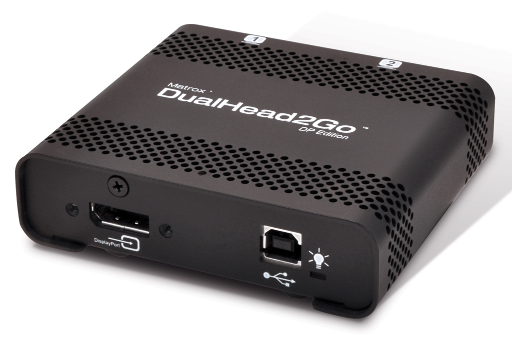 Los adaptadores de monitores múltiples externos Matrox DualHead2Gonconectan dos monitores o proyectores a un ordenador portátil o un PC, y utilizan el GPU del sistema para proporcionar gráficos y contenido de video sin comprimir de alta calidad a través de todos los monitores. El escritorio en pantalla ampliada permite a los usuarios ejecutar aplicaciones de pantalla completa en cada pantalla o abrir un programa a través de las dos salidas.