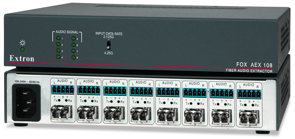 エクストロン エレクトロニクス ha presentado el FOX AEX 108, un extractor de audio de fibra óptica de ocho puertos para procesamiento y enrutado independiente de señales de audio en un sistema de distribución AV de fibra óptica. Cada puerto acepta señales de un transmisor de la serie FOX para extraer una señal análogica de audio desde dos canales y después retransmitir la señal original a un receptor de la serie FOX.