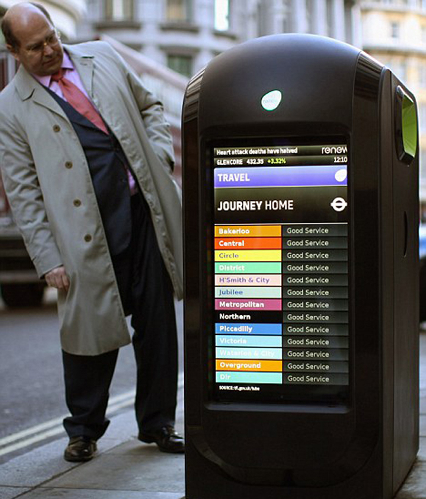 Los ciudadanos de Londres que no puedan recurrir a sus smartphones para conocer las últimas estadísticas de los mercados bursátiles o para consultar los retrasos del metro cuentan con un nuevo aliado en los 25 contenedores de reciclaje digitalizados que se han instalado recientemente por toda la ciudad. Estos contenedores, desarrollados por la empresa Renew, se promocionan como un medio para aumentar la seguridad en zonas de elevado tráfico y para mejorar el reciclaje de los habitantes de la capital británica.