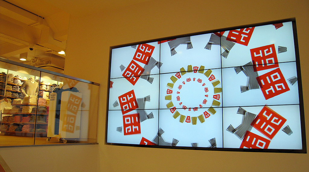 El innovador sistema reduce los costes de la publicidad basada en papel como, 例えば, los carteles, y contribuye a crear una atmósfera estilosa en las tiendas. Las dos tiendas UNIQLO, propiedad de Fast Retailing, utilizan más de 30 displays ultra estrechos de 46 pulgadas de NEC para presentar anuncios de forma automática, incluyendo productos y modelos. Las pantallas individuales se combinan ya sea como grande s paneles de 3 による 3 o cuatro pantallas en una fila multi-display. Una set-top-box basada en Linux, desarrollada conjuntamente por NEC y Miracle Linux Corporation, permite la visualización de contenido de animación en varias pantallas como una sola imagen.