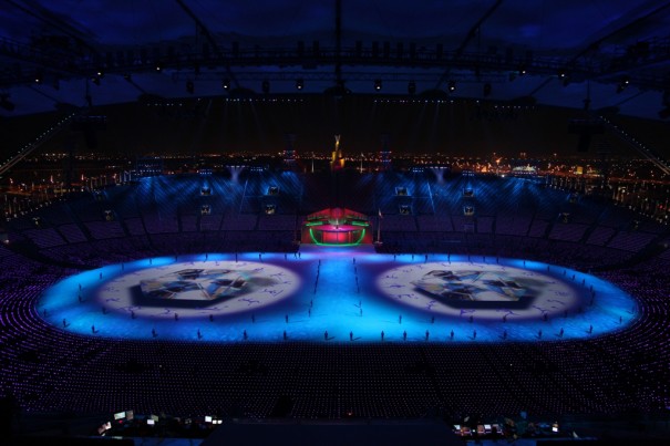 Sobre las gradas situadas en el lado contrario al área de proyección se colocaron dos torres que cubrían la totalidad del Estadio Califa, convertido, 夜になると, en una pantalla gigante. En grupos de tres, ロス 42 Christie Roadster HD18Ks de una torre y los 36 Christie Roadster S+20Ks de la otra se encargaron de iluminar el terreno del estadio y de generar las espectaculares proyecciones en 3D; その間, otros ocho Christie Roadster S+20Ks (cuatro por torre) apuntaban al escenario central erigido junto a las gradas.