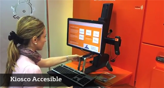 Otro de los elementos claves en este nuevo modelo de sucursal bancaria es un kiosko accesible que emplea una pantalla regulable en altura donde los usuarios con movilidad reducida disponen de la información de todos los servicios de banco. “En él se ubica el ordenador que todos los clientes pueden utilizar de cara a realizar cualquier operación por Internet, llegando incluso a mantener una videollamada con el banco”, explica Roldán. 一方で, en los puestos de trabajo, los ordenadores son de bajo consumo, a pesar de tener pantallas gigantes.