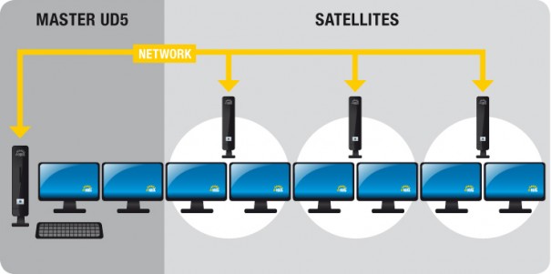 En el centro de la solución hay un thin client IGEL UD5-x30 LX estándar, que viene con dos conexiones de monitor como estándar. Con una tarjeta de red embebida, se puede utilizar como dispositivo maestro para controlar hasta tres thin clients basados en Linux (el IGEL UD2, UD3, UD5 o UD9) como dispositivos satélite, cada uno de los cuales puede soportar hasta dos monitores adicionales.