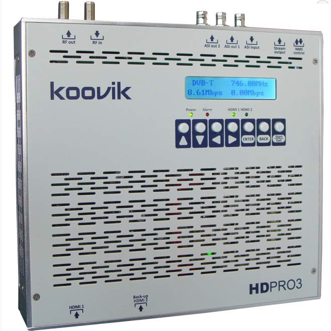El nuevo HDPro3 de la empresa Koovik es un modulador compacto de alta definición de características profesionales, que incluye un encoder HDMI, un multiplexador con entrada ASI, un modulador DVB-T (ISDB-T o DVB-C en opción) y Streamer Multicast para redes GigbE. Su modulador DVB-T hace que el HDPro3 sea la elección ideal para capturar cualquier fuente multimedia de HD, tanto en directo como grabada, y distribuirla en un multiplex en VHF o UHF. Distribuye contenidos HD en redes coaxiales de TDT, en edificios comerciales o de viviendas, 大学のキャンパス, ホテル, 病院, instalaciones militares, デジタルサイネージ, 等.